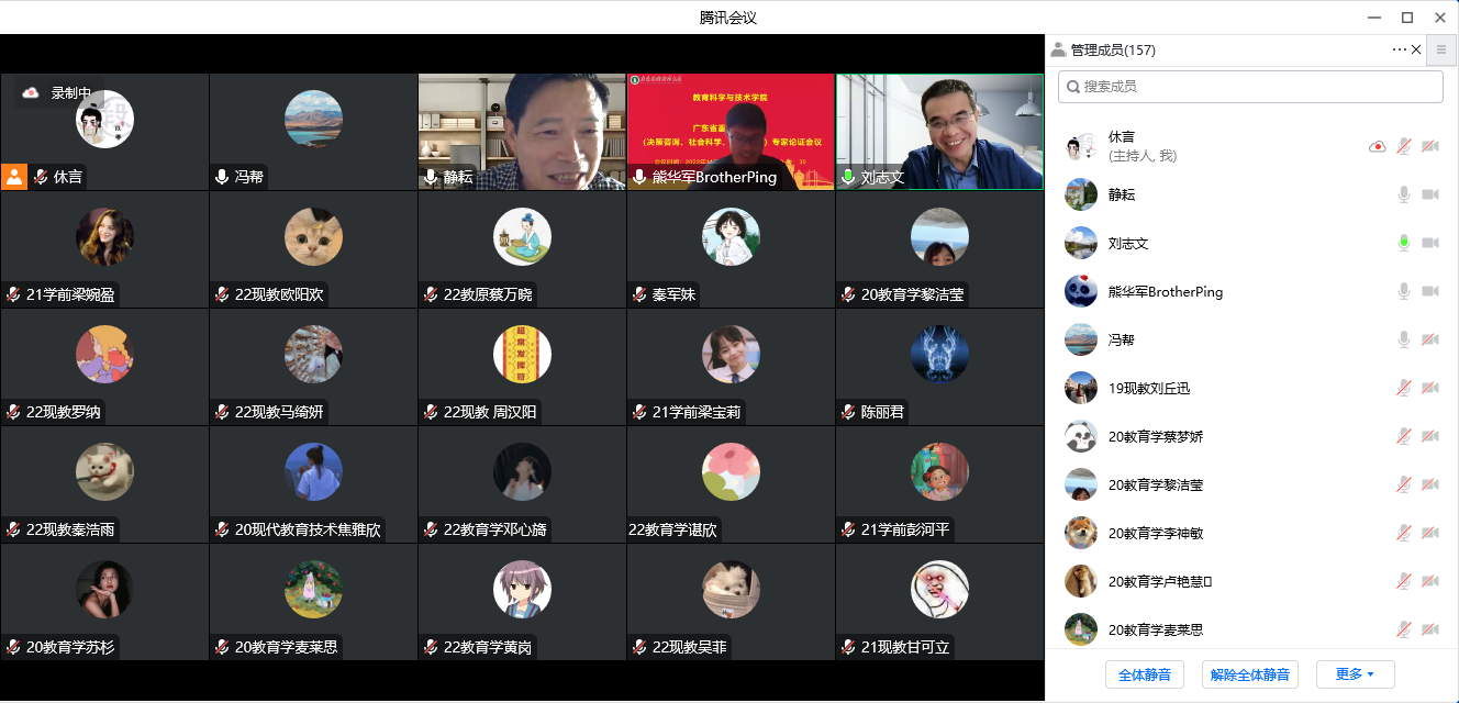 20221110日上午900-1100教育科学与技术公司于腾讯会议召开了广东省重大研究基地(决策咨询、社会科学、岭南文化)专家论证会议。广东开放大学党委书记罗海鸥书记、华南师范大学职业教育公司经理刘志文教授、广东第二师范公司教育公司经理郭凯教授、华南师范大学教科院国际与比较教育研究所所长马早明教授四位知名专家受邀与会,教育科学与技术公司部分教师及全体研究生参会,会议由教育科学与技术公司经理熊华军教授主持。