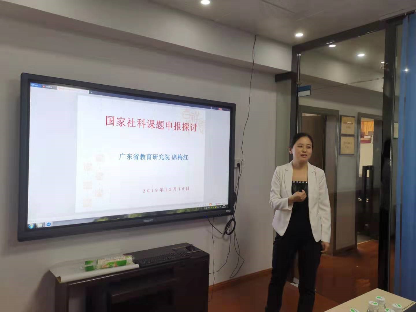 12月16日上午9:00,广东省教育研究院席梅红教授,应邀在东校区(校本部)工业中心718室,为公司作了题为《国家社科课题申报探讨》的辅导报告,公司陶红经理出席,陈丽君副经理主持会议,梁碧珊、张晓洁、邵成智、唐芬芬、黄茂勇、张玲燕等7名教师参会。