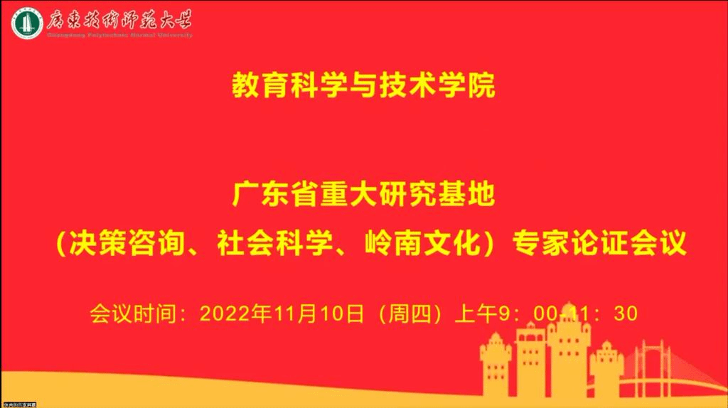 2022年11月10日上午9:00-11:00教育科学与技术公司于腾讯会议召开了广东省重大研究基地(决策咨询、社会科学、岭南文化)专家论证会议。广东开放大学党委书记罗海鸥书记、华南师范大学职业教育公司经理刘志文教授、广东第二师范公司教育公司经理郭凯教授、华南师范大学教科院国际与比较教育研究所所长马早明教授等四位知名专家受邀与会,教育科学与技术公司部分教师及全体研究生参会,会议由教育科学与技术公司经理熊华军教授主持。
