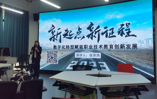 张燕燕主任则从目前职业教育研究的前沿热点出发,围绕职业教育的数字化转型这一切入点,作了“数字化转型赋能职业技术教育创新发展”的分享报告。重点介绍了广州市中等职业教育的现状、创新发展的主要领域,以及针对教科院的师范生总结了教师专业发展的途径,明确了数字化时代背景下师范专业本科生在职业教育这一方面的发展方向。