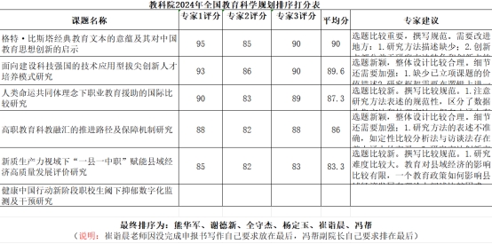 根据 《广东省教育科学规划领导小组办公室关于做好2024年度全国教育科学规划项目申报工作的通知》 及公司《关于组织申报2024年度全国教育科学规划项目的通知》要求,经采用匿名评审校外三位专家打分,按照专家打分结果排序为:熊华军、谢德新、全守杰、杨定玉、崔诣晨、冯帮。