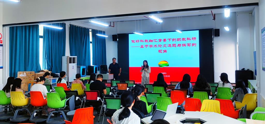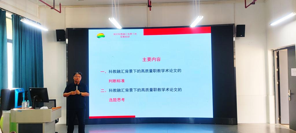 报告一开始,主讲人围绕“科教融汇背景下的职教科研”这一主题展开,深入阐述了如何从学术论文的选题与写作角度推进职业教育科研的发展。报告内容主要分为两个方面:一是如何判断高质量的职教学术论文,二是如何进行职教学术论文选题的深入思考。