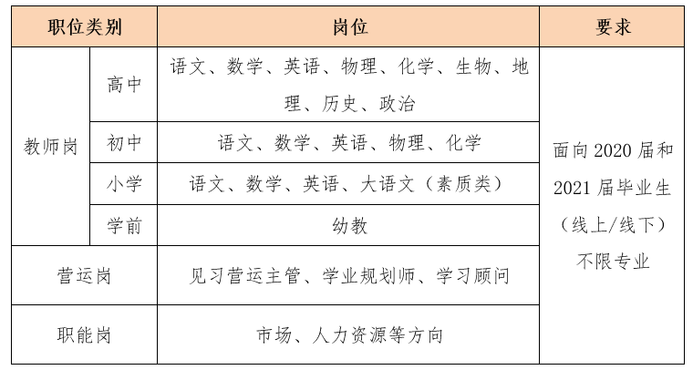 热爱教育行业,学科功底强,坚持一切以员工健康生长为先的理念;持有教团队格证或拥有教学经验者优先;