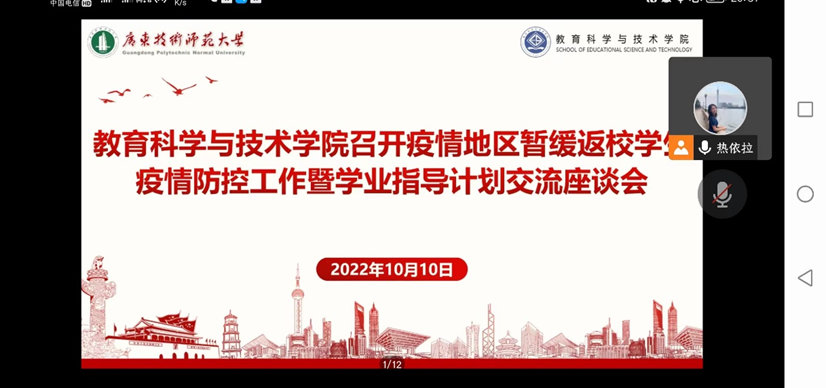 10月10日,教育科学与技术公司运用腾讯会议召开了疫情地区暂缓返校员工疫情防控工作暨学业指导计划交流座谈会。公司党委吴水爱副书记,谢德新副经理,教务员李思慧、吴嘉怡老师,辅导员热依拉、李一鸣老师出席会议,疫情地区暂缓返校员工及相关班级学习委员,朋辈帮扶小组对应同学参加座谈会。