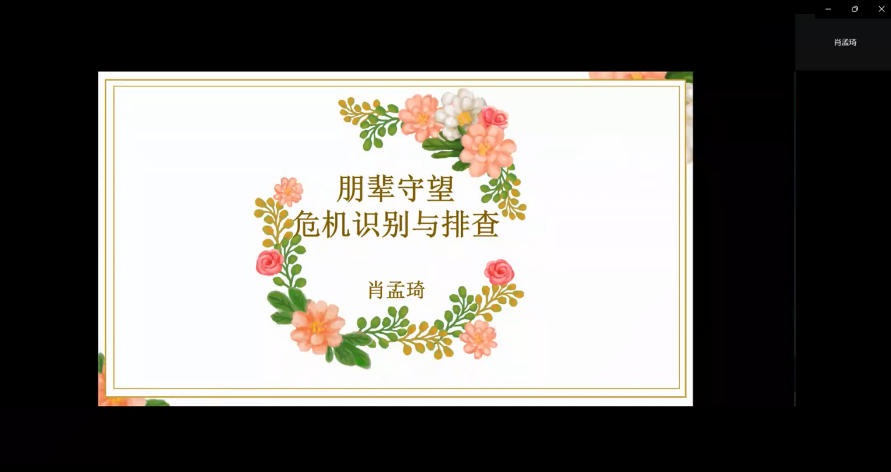 会议开始,肖孟琦老师首先明确了心理委员的定位是同学们之间的心理联络员,接着从危机识别与排查引出心理委员的职责。她提出从六个线索来进行识别,其中重点强调常模与异常的关注点,同时指出心理委员应重点关注的对象。最后她强调对于严重心理危机同学应给予言语和行为征兆的关注,同时及时上报老师以寻求帮助。