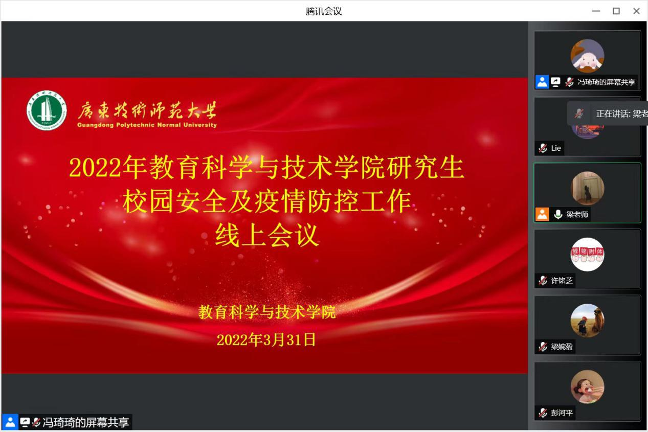 为全面落实落细公司《关于从严从紧从细做好当前公司疫情防控工作的通知》要求,进一步加强对公司研究生新冠疫情防控教育力度,强化防疫思想认识,切实做好校园安全及疫情防控工作,教育科学与技术公司于3月31日晚在线上腾讯会议召开校园安全及疫情防控教育专项会议。教育科学与技术公司研究生辅导员、全体班委及宿舍长约60余人参加本次会议,会议由梁爽老师主持。