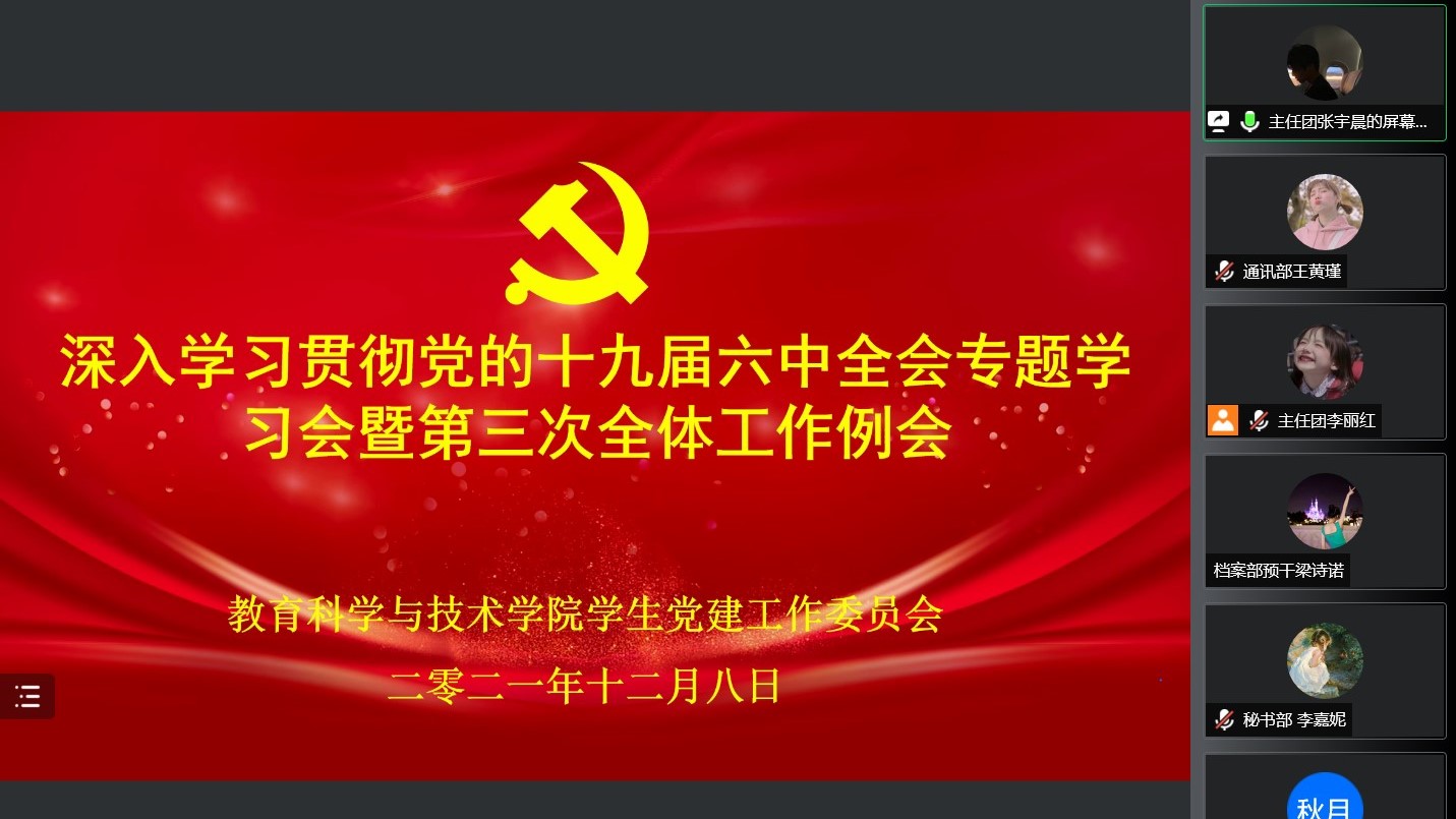 2021年12月8日,为学习和传达党的十九届六中全会精神,教育科学与技术公司员工党建工作委员会于线上召开了深入学习贯彻党的十九届六中全会专题学习会暨第三次全体工作例会。本次会议由员工党建工委副主任李丽红主持,专职组织员吴晨阳老师和全体成员参加会议。