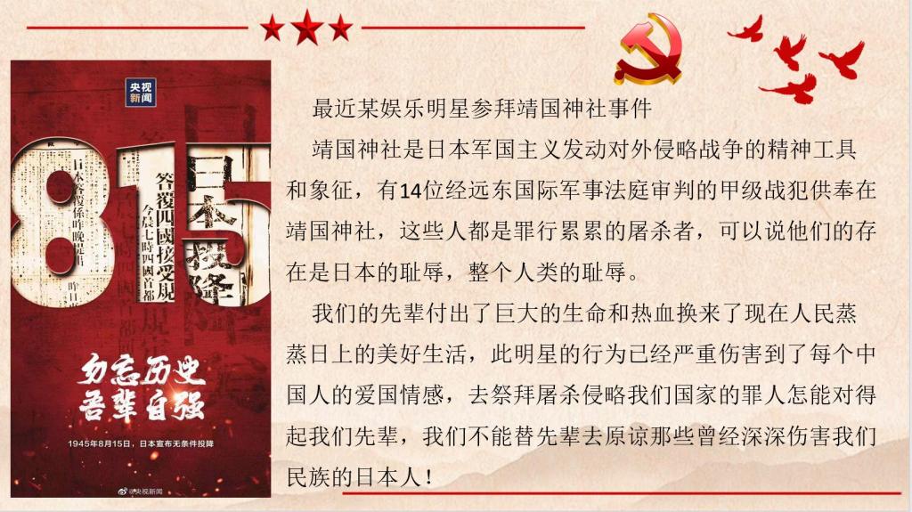 76年后的今天,山河已无恙,中国人民正迈着稳健的步伐迎来中华民族的伟大复兴。通过815日学习专题,我们对这一天有了新的体会和启发:作为我们现代青年,我们的心中不应带着仇恨,而是带着满满的爱国热情,投身到各自岗位努力奋斗,一起拼搏,只有把我们的国家建设的更强大了才能让捍卫住我们先辈牺牲的生命和热血意义,才能让我们在国际中有更多的话语权,以此历史为警钟。(研究生第一党支部 供稿)