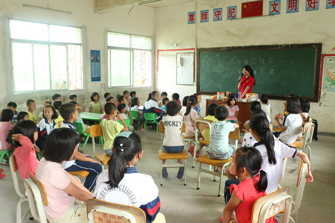 在班会上,为了增进大家的了解,支教队员们依次做了自我介绍。接下来就进入了我们发礼物的环节,我们将事先准备好的礼物拿上讲台,同学们看到礼物都非常兴奋,上台拿礼物的时候,同学们也进行了自我介绍,或羞涩讲出自己的名字或把它写在黑板上。随后班会课的气氛格外活跃,支教队员们和孩子们很快地打成一片。