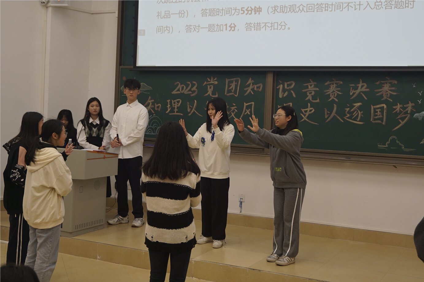 随后,主持人为我们详细介绍了本次大赛的比赛规则及比赛注意事项。本次竞赛采取积分淘汰制,决赛共分为三个环节,第一环节为基础答题环节,参赛队伍可选择难易两组不同的题组进行答题,竞赛题目主要围绕党的二十大精神,以党的二十大报告原文为题目;第二环节为“畅所欲言”,六支队伍队长现场抽签,根据抽签结果两两队伍配对进行比赛;第三环节为“情景再现”,由第二环节胜出的三支队伍各自选出两名队员上台进行比划,其余队员在台下负责猜出题目。