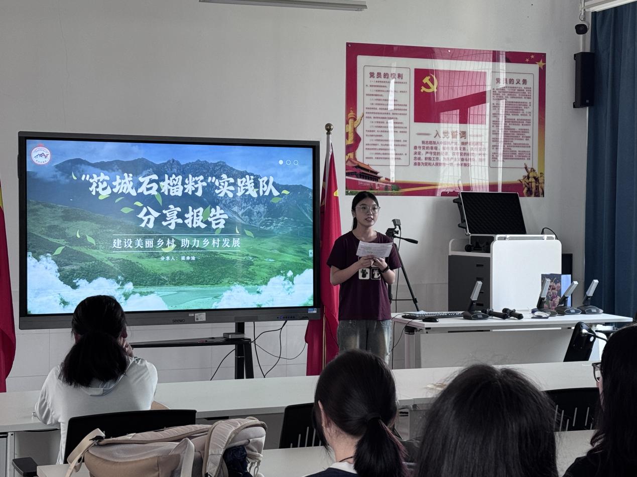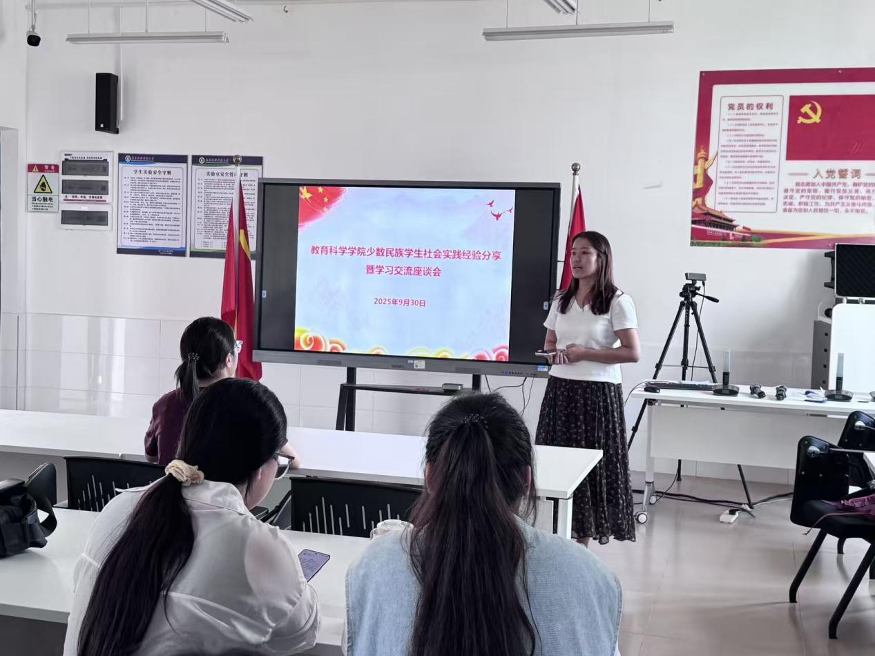 在经验分享环节,2023级教育技术学(师范)2班梁幸瑜同学率先发言,聚焦暑期“百千万工程”社会实践活动,生动讲述了自己所在的“花城石榴籽实践队”的实践经历。她从实践项目策划、服务内容开展、团队协作细节等方面展开,结合亲身经历分享了实践中的收获与感悟,同时热情呼吁在场少数民族同学积极加入各类社会实践活动,在服务基层、奉献社会的过程中提升自我、实现价值,其真诚的分享引发了在场同学的广泛共鸣。