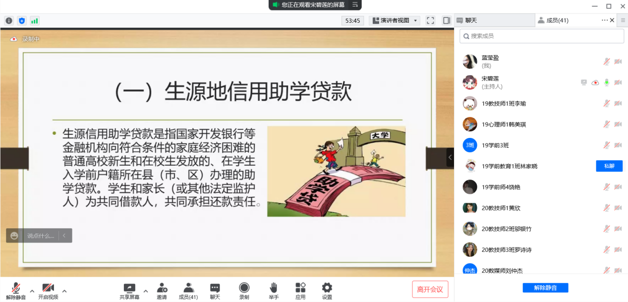 为深入开展生源地信用助学贷款宣传工作,公司勤工助学服务中心在2022年5月31日晚上20点召开了一次以“生源地信用助学贷款”为主题的线上会议。本次会议勤工助学服务中心对生源地信用助学贷款政策、贷款申请条件、申请程序及相关注意事项这四方面进行了详细的讲解;有效地促进助学委员对生源地信用助学贷款的进一步了解,为接下来工作的顺利开展奠定了基础。