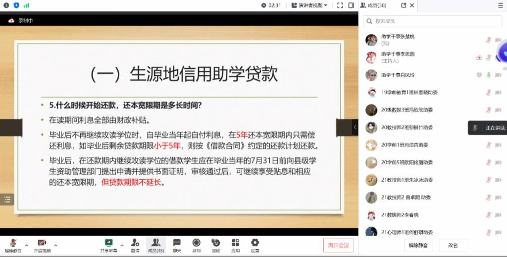 为进一步加大生源地信用助学贷款宣传,公司勤工助学服务中心于2023年6月1日晚上20点召开了一次以“生源地信用助学贷款”为主题的线上会议。本次会议分别从介绍生源地助学贷款、贷款申请的基本条件、申请流程以及注意事项4个方面进行讲解,既增进了助学委员对生源地信用助学贷款的了解,也为今后助学委员服务同学和协助勤工助学服务中心工作的顺利进行提供了有力的保障。