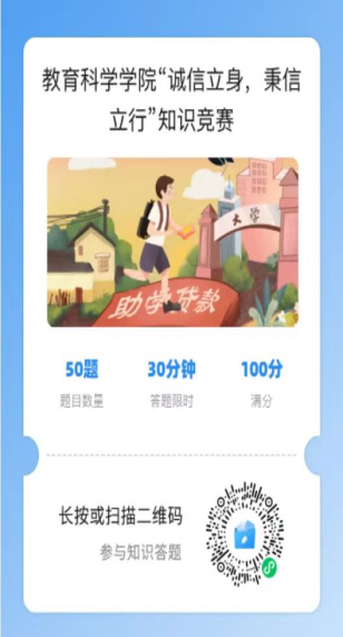 为了让诚信之风吹进校园每一个角落,扩大诚信教育活动覆盖面,公司勤工助学服务中心开展2023年员工资助“诚信教育主题月”活动,于5月20日上午11:00向全院员工发起以“诚信立身,秉信立行”为主题的贷款知识竞赛,利用在答题帮手小程序上答题方式开展,试题包括单选题,多选题和填空题,试题内容聚焦助学贷款诚信教育,不断加强公司员工的诚信建设,强化公司的诚信氛围,用诚信营造良好的校园风气。