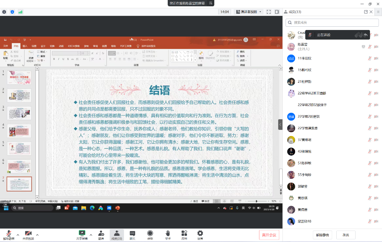 为进一步加强公司员工的德育教育,培养以德立身、自强不息的新时代老员工,公司勤工助学服务中心于2023年4月18日组织全院各班助学委员就“社会责任感”主题开展主题班会。本次会议中,各班助学委员分别从社会责任和社会责任感的含义、重要性、缺失现状、缺失原因及增强自身社会责任感的相关途径五个方面进行展开,进一步强化了同学的责任意识,不仅有利于同学将社会感恩意识内化于心、外化于行,还有利于落实相关资助工作精神,打造实用型人才,为加强公司校风、学风建设奠定了基础。