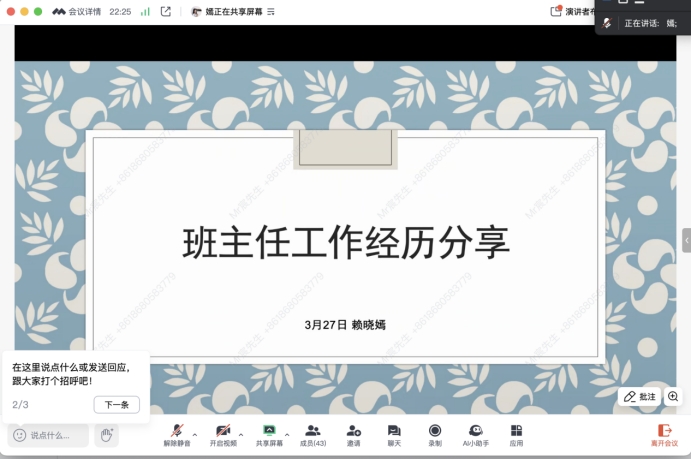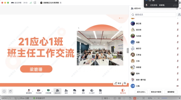 会上,2023-2024学年优秀班主任代表赖晓嫣、梁碧珊老师分别进行工作经验交流,两位老师以班主任视角,向与会老师细致阐述了各自在班主任工作中的实践举措、深刻思考以及宝贵经验。赖晓嫣老师主要从归属感、成就感、幽默感三个方面进行分享,梁碧珊老师从建设班级凝聚力、提升专业认同、关爱特殊员工和助力未来规划等方面展开。随后,吴晨阳老师结合《韦德官方网站班主任工作实施办法》(广师大〔2020〕268号)文件,从班主任工作要求与岗位职责、员工管理与心理辅导、意识形态安全和校园安全教育、班主任考核和员工宿舍公约五个方面展开解读,明确了班主任在促进高校班级建设与管理中的积极作用和育人方向。