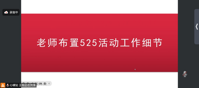 会议开始,由秘书部部长王栩总结上次心理微课征集活动决赛的经验,主要是关于作品拷贝等问题;接着由活动部部长陈良书介绍5·25游园会活动内容,讲解活动游戏进行规则;最后是热依拉老师布置5·24活动的工作细节。