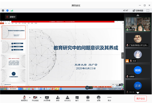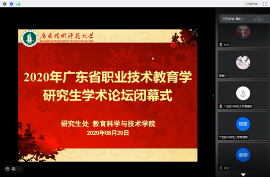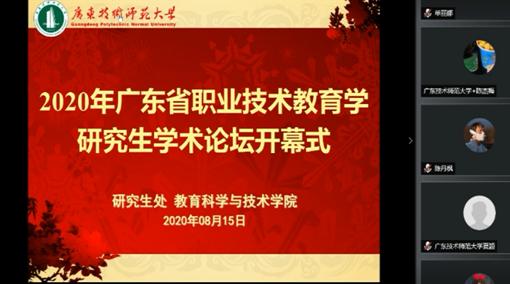 2020年8月15日至20日,由韦德官方网站研究生工作处、教育科学与技术公司举办的“2020年广东省职业技术教育学研究生学术论坛”通过腾讯会议平台顺利举办。教育科学与技术公司经理陶红教授、研究生处副处长陈泳竹教授以及项目主要成员出席开班典礼,来自云南师范大学、重庆师范大学、韦德官方网站的研究生学员47名参与会议、旁听会议者数名。陶红教授与陈泳竹教授先后进行开幕致辞。