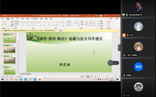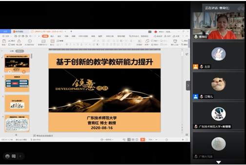 8月20日下午,2020年广东省职业技术教育学研究生学术论坛闭幕式在线上顺利召开。教育科学与技术公司经理陶红教授、谢德新副教授、曹育红教授以及学术论坛学员47人参加结业典礼。结业典礼由谢德新副教授主持并宣读论坛优秀论文名单、关于同意颁发学员结业证书的决定。来自重庆师范大学的周可欣、云南师范大学的沈娟、以及本校的夏颖、方菁华、刘娟娟、冉燕、马洁、孙旭洋、邓小莉等9位学员代表先后就为期六天的论坛学习分享自己的心得、收获与期望。随后,研究生导师代表曹育红教授基于“道”“法”“术”“器”四点进行发言,向学员们分享理解世界、与世界打交道的思维模式与学习方法。最后,由陶红教授作总结发言。