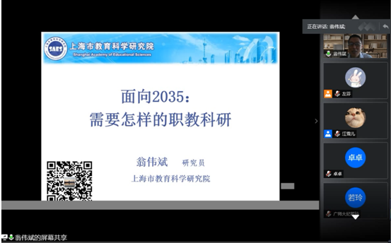 《教育发展研究》资深编辑翁伟斌研究员,围绕“面向2035:需要怎样的职业科研”的主题展开报告。讲座伊始,翁教授从时间、空间两大维度对职业教育与普通教育的区别进行阐述,基于“仁川宣言”五个关键词,深入解读国家职教二十条,并对职业教育十大研究主题进行梳理,从“研究目的”、“研究主体”、“ 研究方式”等角度思考研究范式,为员工指明了职业教育科研未来的研究方向、研究热点与选题重点。