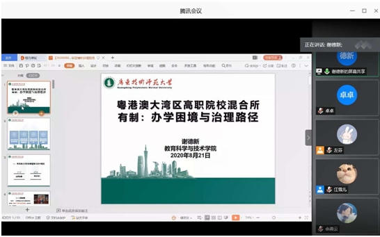 教育科学与技术公司副经理谢德新副教授,围绕“粤港澳大湾区高职院校的混合所有制:办学困境与治理路径”的主题,对湾区的发展背景与基本情况展开较为全面的介绍,并针对粤港澳大湾区高职院校混合所有制存在的“顶层设计缺乏”、“政策协同不够”、“法律体系差异”、“政治制度特殊”等办学困境,提出关于湾区高职混合所有制有效办学治理路径的思考,理据充分,对员工了解湾区研究湾区有较大的参考价值。