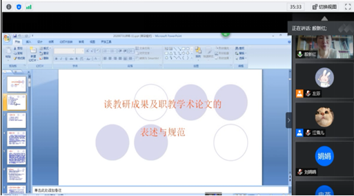 《职教论坛》杂志副社长殷新红教授,以“谈教研成果及职教学术论文的表述与规范”为题,从多维度阐述教师做科研的必要性,并对学术论文的规范要求、论文写作原则进行详细介绍。结合多年办刊组稿经验,殷教授从“紧贴职业教育动态”“选取热点问题”“瞄准职业教育难点”“根据职业教育改革实践成果推出全程报道”“创新”五方面分享选题经验。