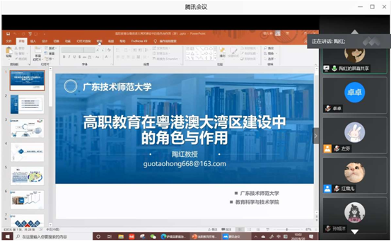 教育科学与技术公司经理陶红教授以“高职教育在粤港澳大湾区建设中的角色与作用”为题,通过对粤港澳大湾区概念、特征与变迁进行梳理,深入解析粤港澳大湾区建设的目标与劣势,继而概括出高职教育在粤港澳大湾区建设中的地位与作用,以及高职教育在粤港澳大湾区建设中“高端技能型人才的供给者”、“产业转型升级的引擎”、“产业融合的催化剂”、“创新驱动发展战略的重要抓手”的角色定位。