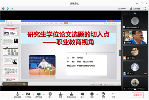 湖南农业大学周明星教授围绕“研究生学位论文选题的切入点——职业教育视角”,从主体包含的“新领域”“新高度”“新发现”“新视角”“新阐释”“新思路”“新探索”“新融合”“新突破”“新价值”八个部分进行深入剖析,以从教培养研究生、科研工作和所获成果为例,鼓励研究生应当在选题中围绕八大要点并体现学术创新精神。周教授为参会研究生的学位论文选题提供了宝贵的指导意见。