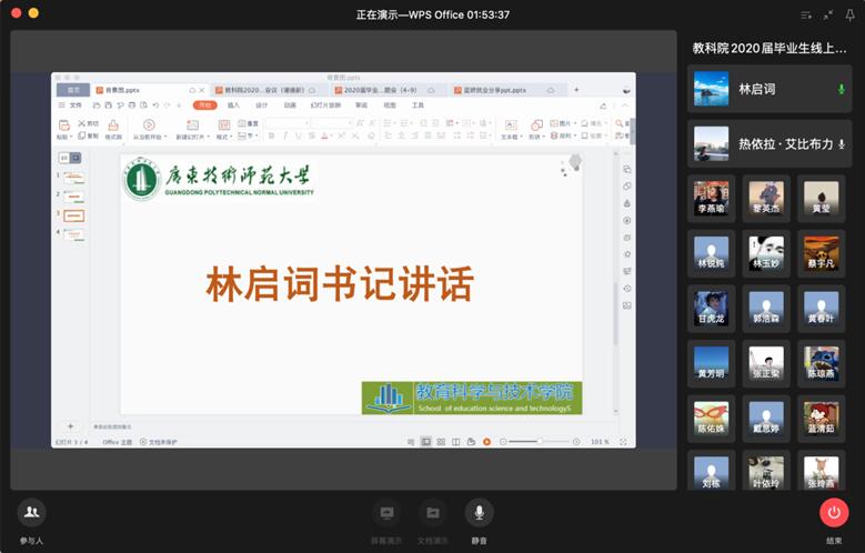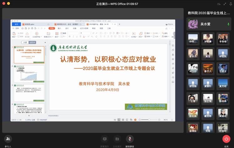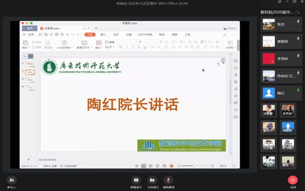 根据教育部、省教育厅和公司《关于做好公司2020年毕业生就业创业工作的通知》等要求,为提高员工对当前就业形势的认识和行业发展的了解,增强毕业生的核心竞争力和主动就业意识,4月9日下午,教育科学与技术公司召开2020届本科毕业生线上年级大会。公司党委林启词书记、陶红经理、吴水爱副书记、谢德新副经理、党政办主任常锋峰、各系主任孙文云、张玲燕、黄芳明、陈雪梅、毕业班班主任、辅导员、教务员等老师和全体2016级员工参加会议。会议由辅导员热依拉老师主持。