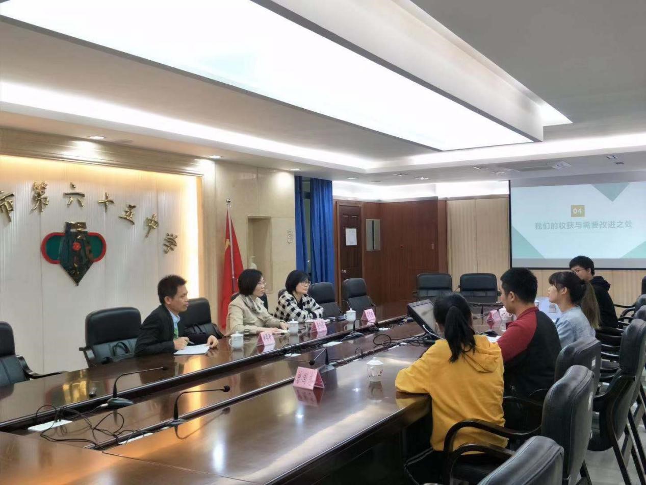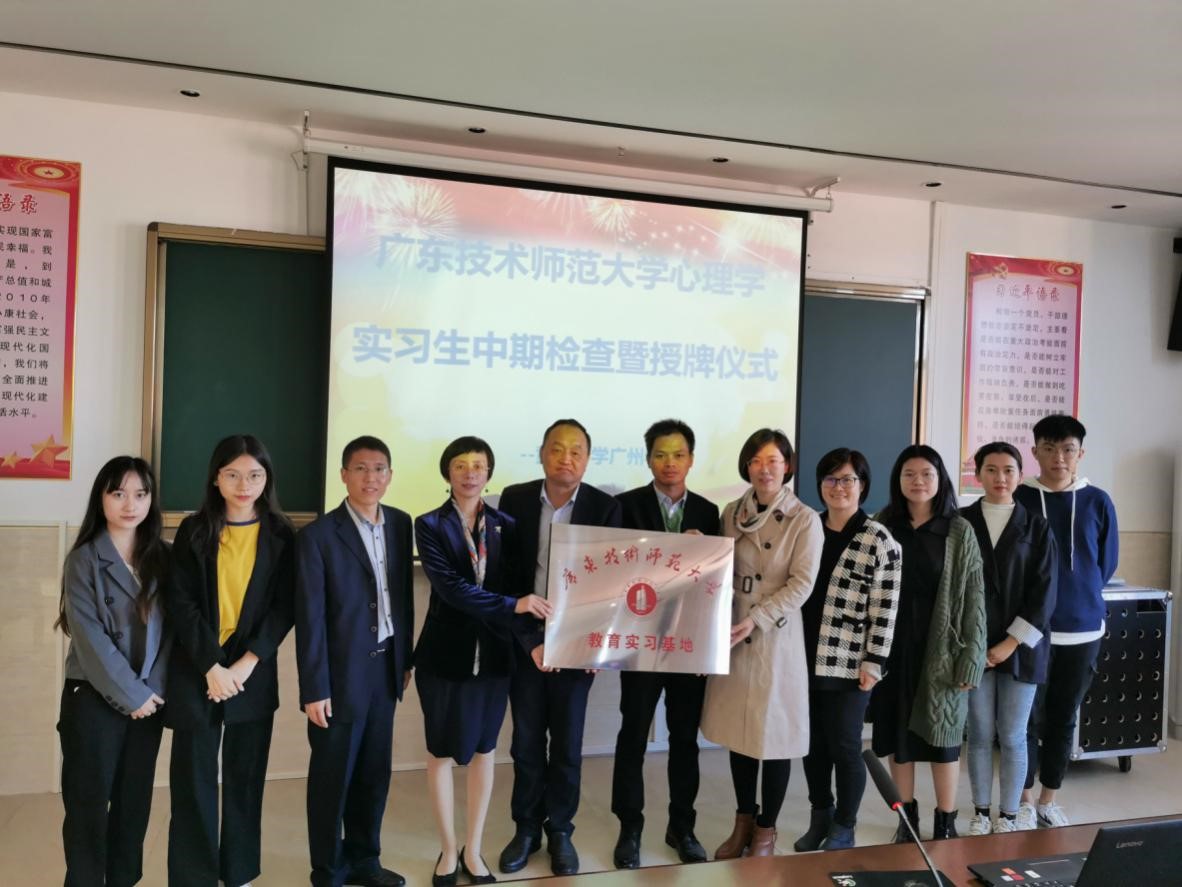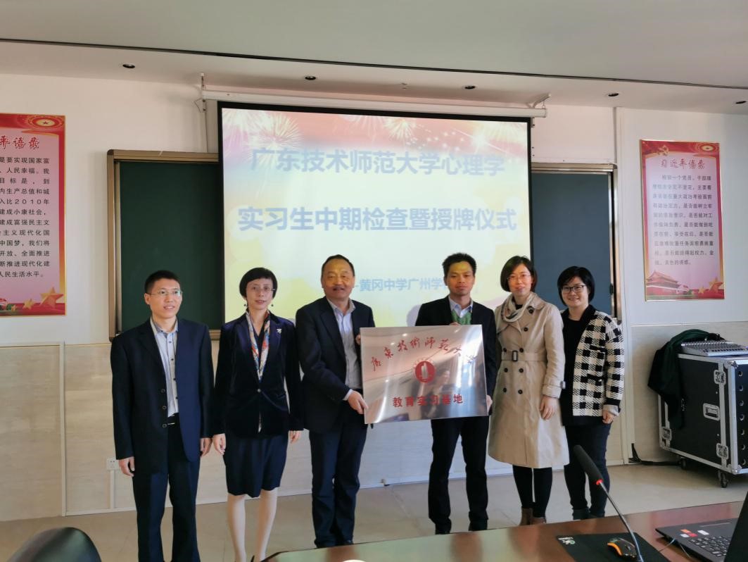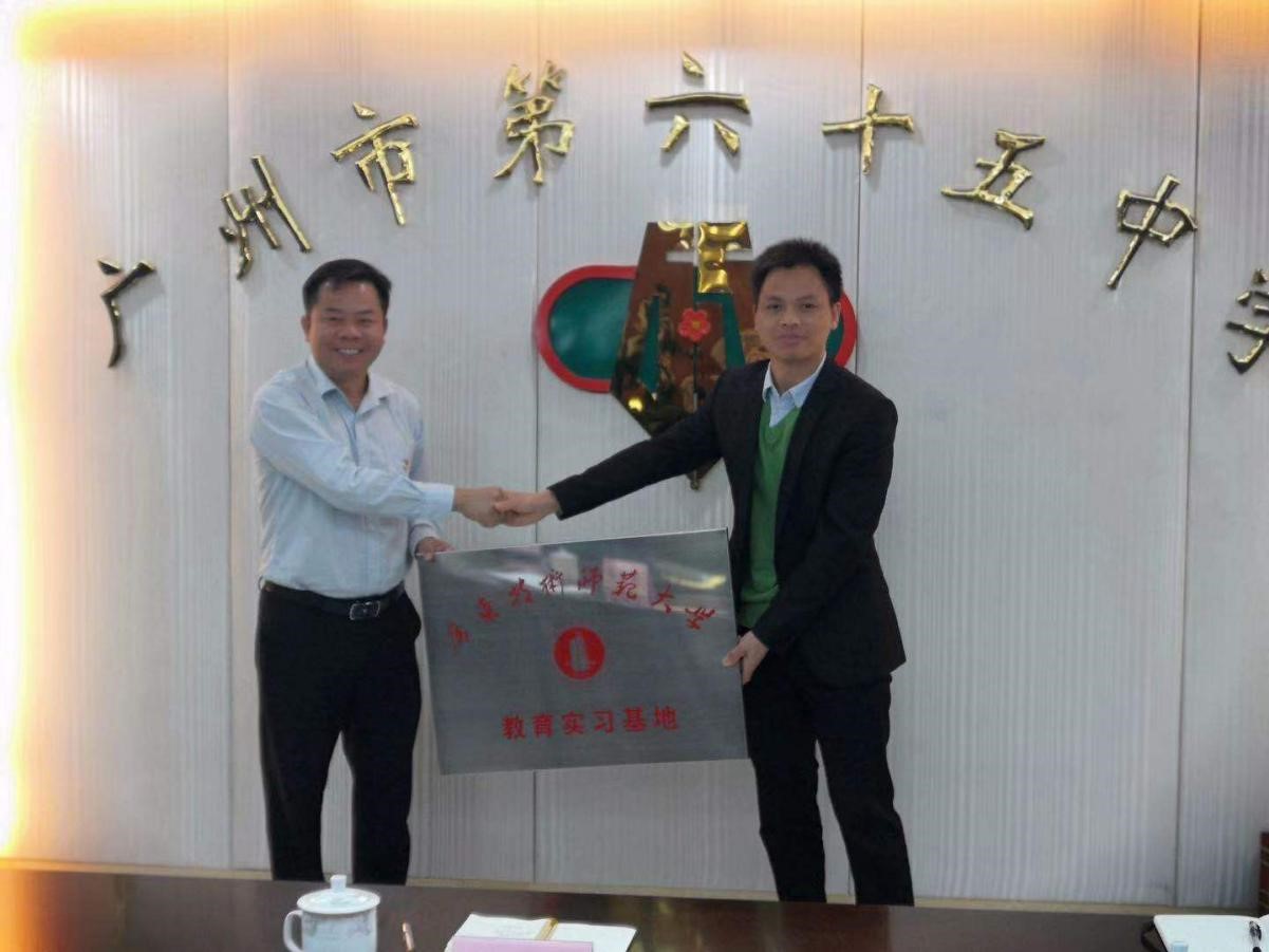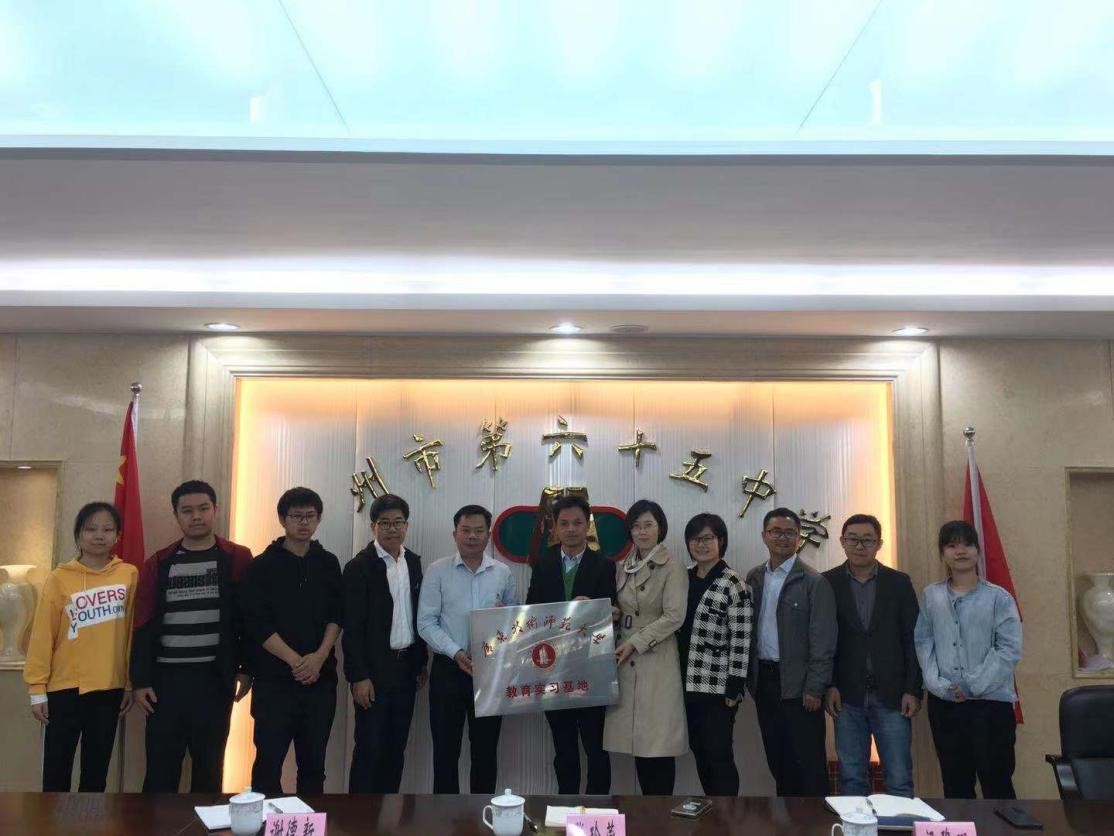 教师一行首先在广州市第六十五中学进行实习的四名学子进行实习基地挂牌暨实习教育中期检查工作。广州市第六十五中学罗锐杰副董事长、曾国志主任、陈健国主任出席会议。