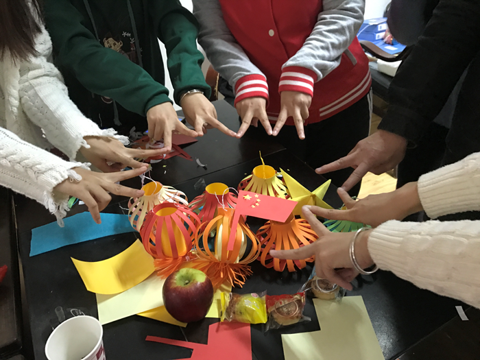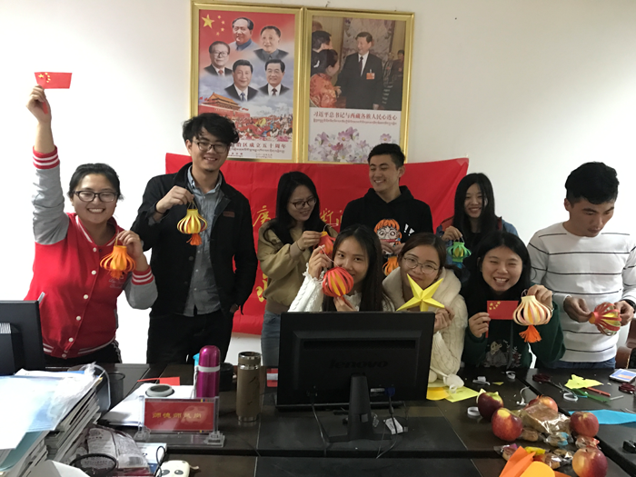 国庆节是祖国母亲的生日,中秋节是举家团员的喜庆日子,今年两节喜相逢。每逢佳节倍思亲,身在祖国遥远边疆的援藏师生,虽然要坚守在支教岗位上,不能与千里之外的家人团聚,但是用自己的行动和语言向祖国母亲献上生日的祝福,是每个中华儿女心中最真挚的愿望。广东技术师范公司援藏小分队,在指导老师朱姝的带领下,在祖国68岁生辰之际,亲手制作国旗、五角星和灯笼,送上大家祝愿祖国繁荣昌盛的心愿。