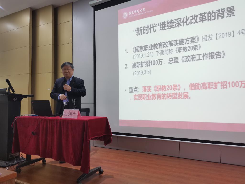 2019年12月3日上午,“韦德官方网站教育名家讲坛”第三期在公司东校区第一教学楼209讲学厅成功举办。本次讲坛邀请的主讲嘉宾是华东师范大学终身教授、博士生导师、华东师范大学职业教育与成人教育研究所名誉所长石伟平教授。