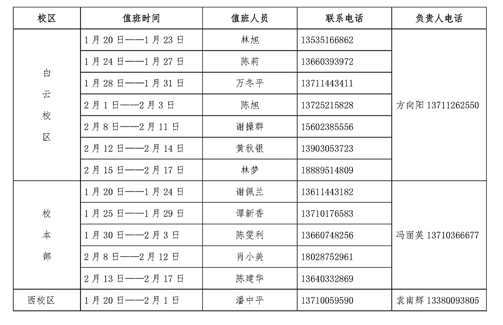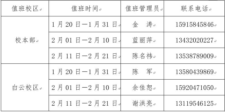 根据公司放假安排,教师放假时间为2019年1月20日至2月21日。寒假期间,实验室将不对外开放,实验设备一律不外借。寒假期间实验中心的值班安排情况如下: