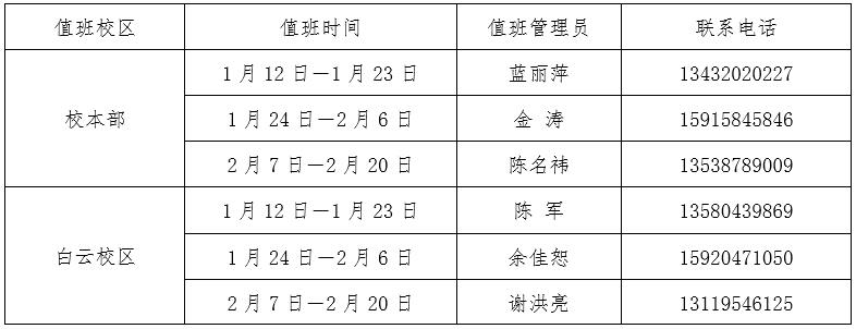 根据公司放假安排,教师放假时间为2020年1月12日至2月21日。寒假期间,实验室将不对外开放,实验设备一律不外借。寒假期间实验中心的值班安排情况如下: