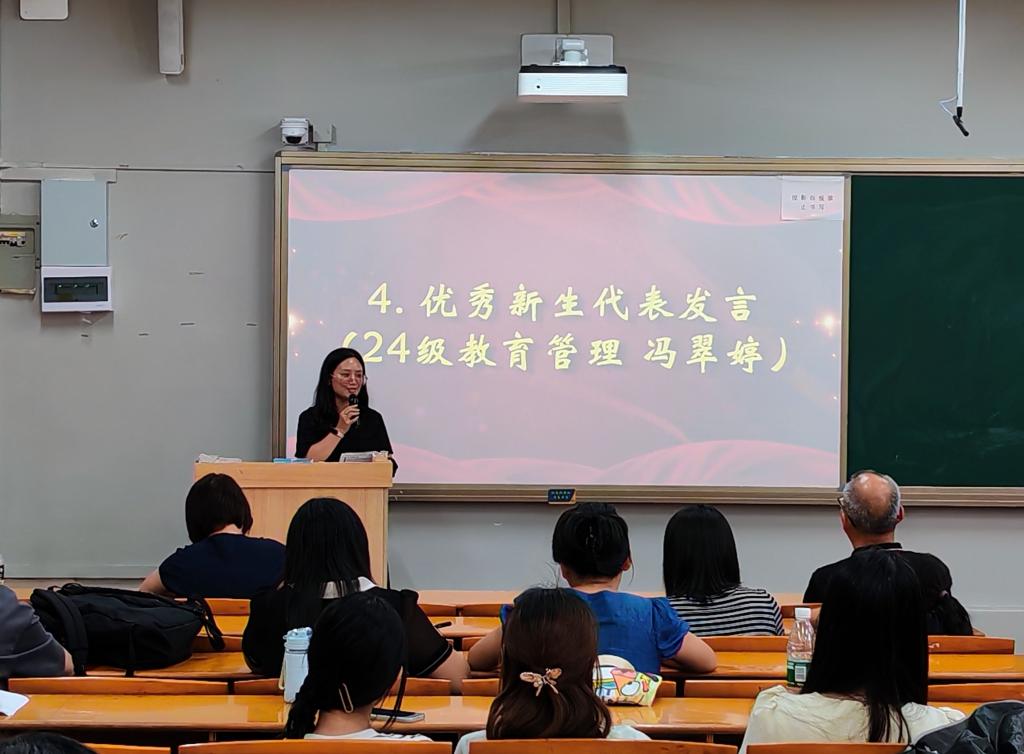 2024级教育管理专业的冯翠婷同学向大家分享了自己实现人生目标的喜悦与重回校园的感想,表达了对未来学习生活的期待和憧憬,表示将努力学习专业知识,提高自己的综合素质,不辜负公司和老师的期望,以优异的成绩完成学业。