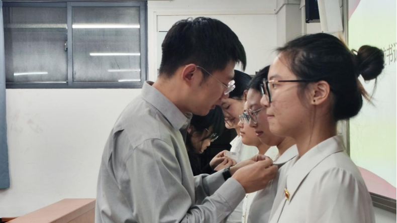 随后,在全体与会同志的见证下,党支部书记袁炜老师与特邀嘉宾徐绫霞老师共同为新发展的五名预备党员佩戴党徽。在支部书记袁炜老师的领誓下,新预备党员面向党旗进行庄严宣誓,全体党员重温入党誓词,积极分子一同宣誓感受氛围。最后,全体与会人员集体合唱《国际歌》。