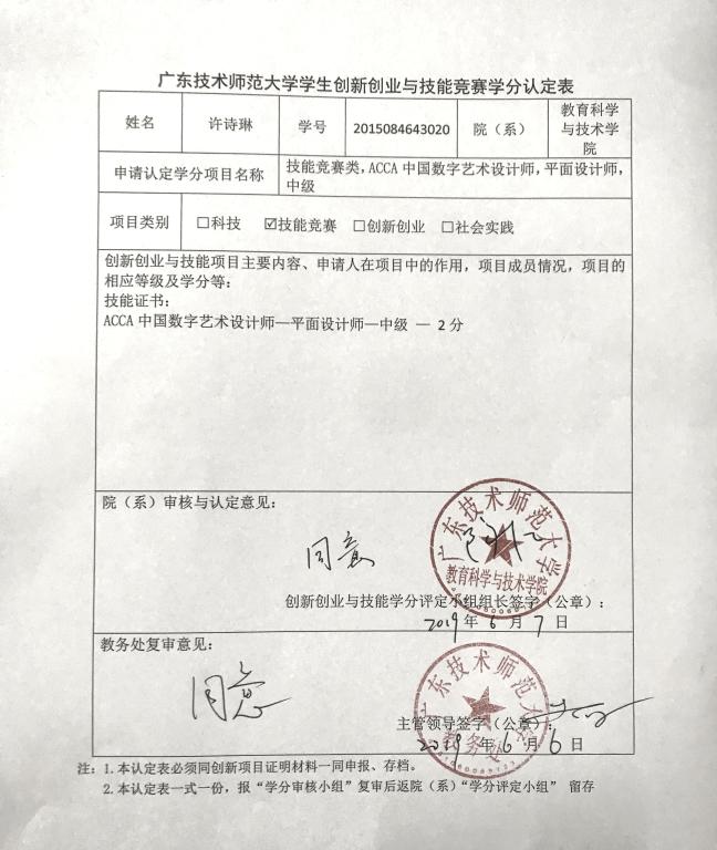 韦德官方网站创新创业与技能竞赛学分认定表 许诗琳
