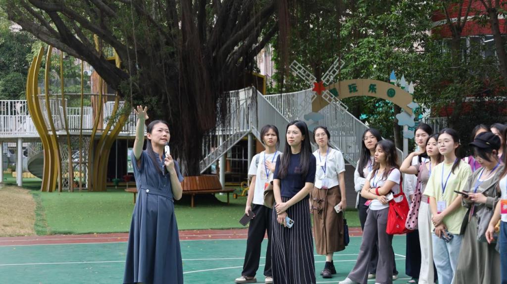 会前,华嘉副园长带领同学们参观了顺德机关幼儿园的户外环境,耐心地为参观人员讲解该园的起源与发展,介绍了户外丰富多彩的环境设施设备。