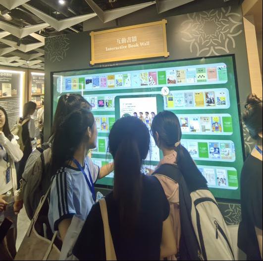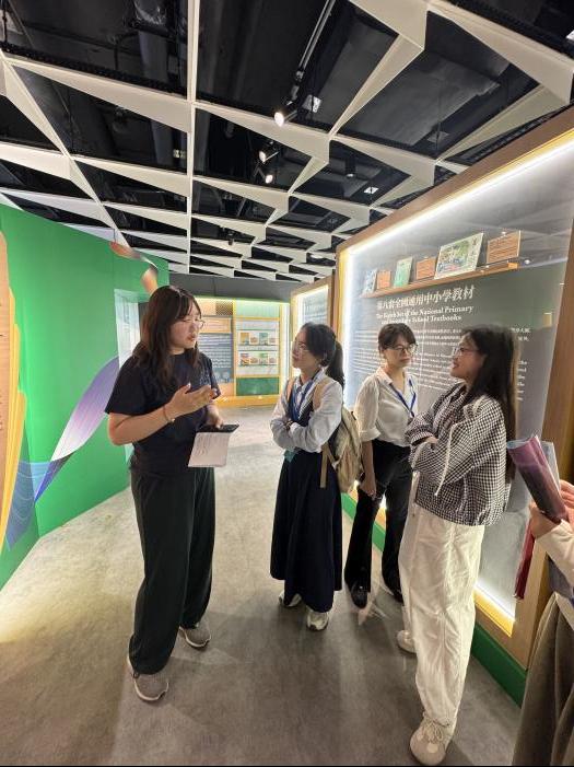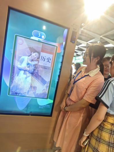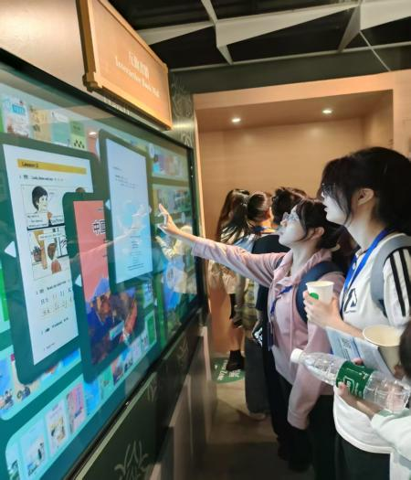 在数字化互动区,师生们体验了“活态教材”交互系统。轻触屏幕,1950年代的语数英等课的内容便尽数呈现;教育管理研究生许同学在电子书墙前操作时说:“这种书籍的数字化陈列方式,让多年前的学过教材又一次呈现在我们眼前。”