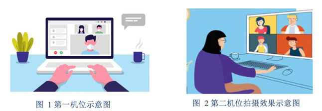 (1)复试设备要求:准备可以支撑“双机位”运行的硬件,即需要两部带摄像头的设备及附件,包括笔记本电脑、手机、手机支架等。一台设备(第一机位)从正面拍摄,放置在距离本人30cm处,另一台设备(第二机位)从考生侧后方45cm;距离本人30cm处拍摄,确保第一机位和第二机位分别从考生面前和身后完整拍摄到考生全身、复试组教师能够从第二机位清晰看到第一机位屏幕。效果图如下。